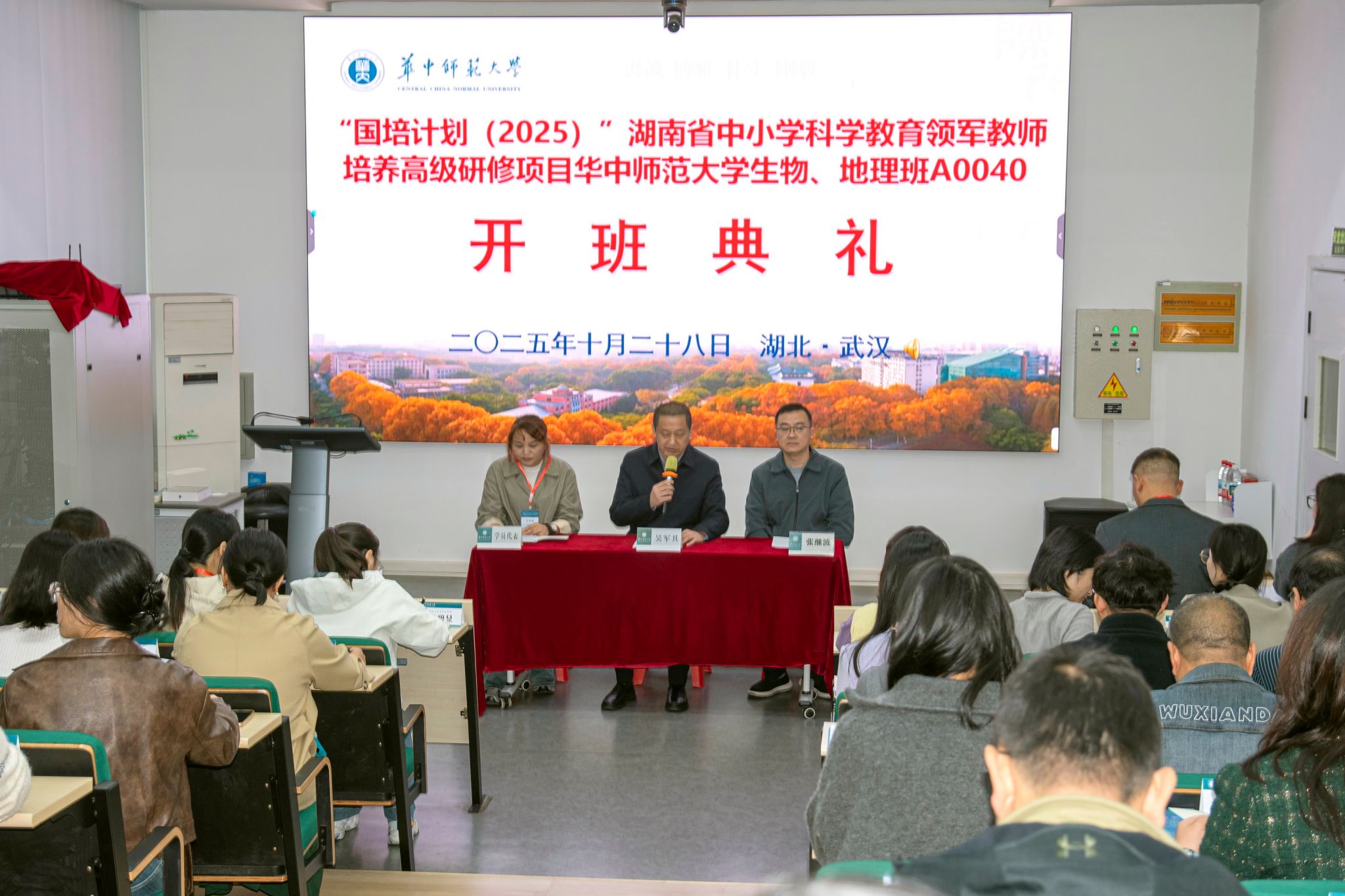 2025年10月28日上午,“国培计划(2025)”——湖南省中小学科学教育领军教师培养高级研修项目bv伟德体育斯洛克生物、地理班开班典礼在教师教育学院A101教室举行。教师教育学院副院长吴军其,研修班班主任张继坡,以及来自湖南省14个地市州的60名中学生物、地理骨干教师出席了典礼。