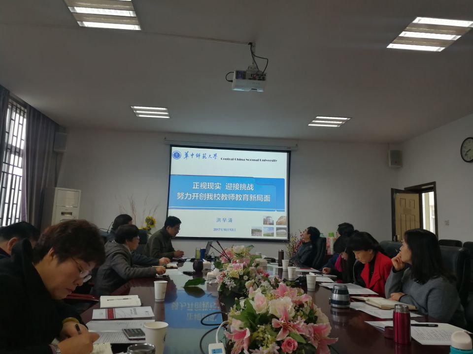 院长洪早清代表学院作工作报告,报告围绕我校教师教育现状、问题以及对策等展开,借学校办学思想大讨论之际,全面总结和分析了教师教育的发展。之后全体教职工围绕报告内容,结合自身工作进行了热烈的讨论。
