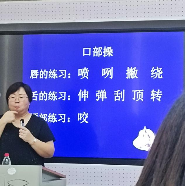 杜宇虹带领同学们结合绕口令做口部操热身训练,对唇、舌、颊部进行了练习。为提高选手们普通话水平测试的水平,杜宇虹介绍了普通话考试等级和测试内容,引导选手们注重学习方法。她详细讲述了声母韵母的分类和发音方法,通过大量难点音的例子,介绍了平翘舌的标准发音方法,向选手们提供了“形声字声旁类推”“记少不记多”的学习窍门。