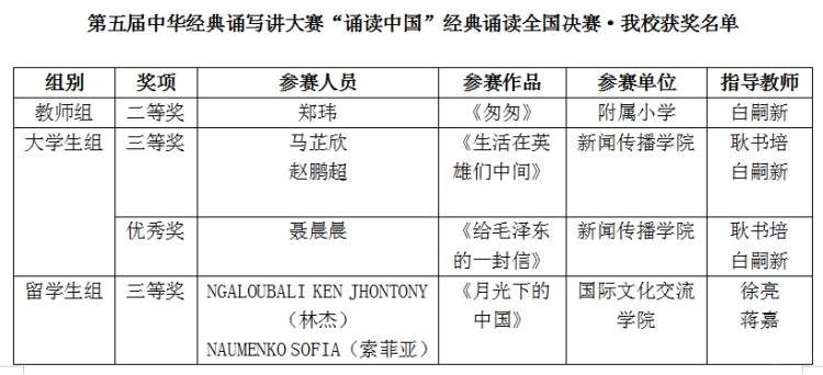 华大在线讯(通讯员 申定羽)近日,第五届中华经典诵写讲大赛“诵读中国”经典诵读大赛完成全部赛程,我校荣获教师组二等奖1项,大学生组三等奖1项、优秀奖1项,留学生组三等奖1项等4个奖项。