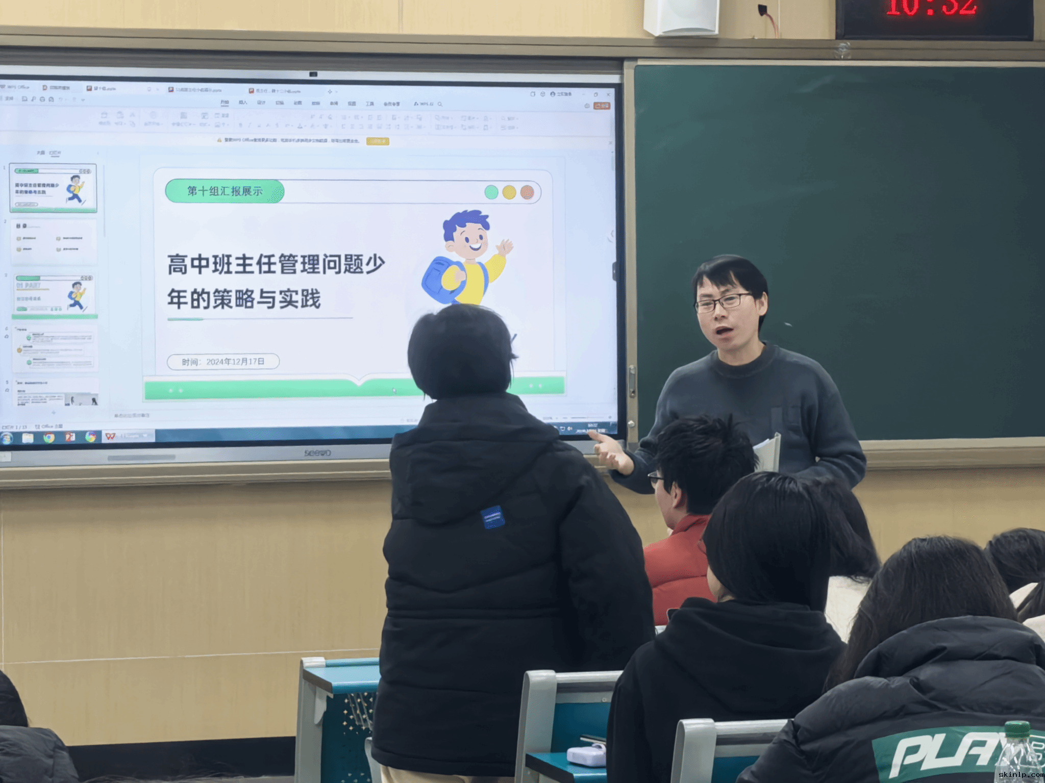 课堂上,两组学生依次针对“问题少年管理策略”“学生情绪心理问题解决”的主题展开汇报。汇报以情景模拟和集体研讨相结合的形式进行。汇报结束后,黄凯老师对两组的表现进行了点评和相关问题指导。他首先肯定了学生们在汇报中展现出的热情和专业精神,认为他们将课堂内容巧妙地融入汇报中,使得整个汇报过程既充实又生动。同时,黄凯老师也指出了汇报中存在的一些关键问题,如家校沟通的重要性以及如何界定问题学生等。他强调,家校沟通是解决问题的关键,建议建立更紧密的家校联系机制,共同促进学生成长。